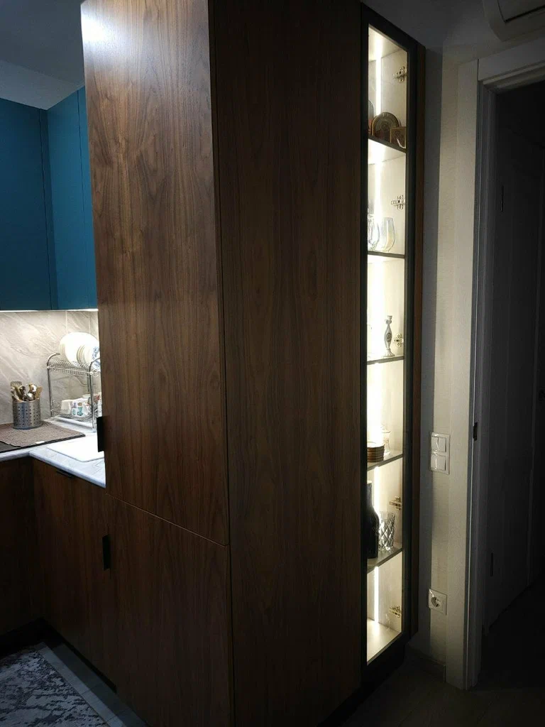 Заказывали большую кухню из натурального шпона сложной конфигурации со встроенными стеклянными шкафами - изготовление и доставка в срок без задержек.